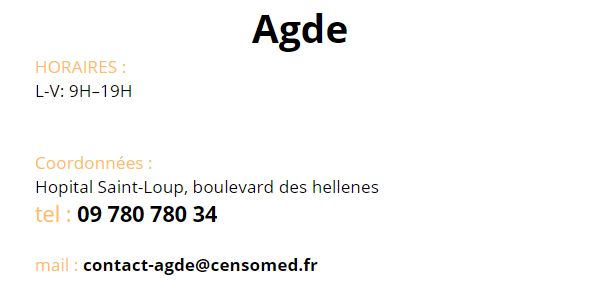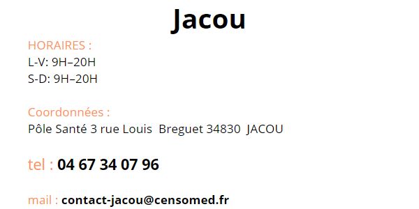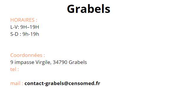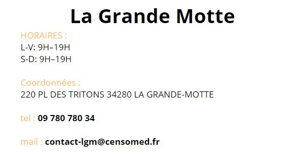 Contact Contactez le Groupe Vous trouverez les coordonnées de chaque centre Censomed sur sa page dédiée Les Centres Contact des Centres Vous êtes patient Utilisez ces informations de contact des centres Numéro unique pour tous les Centres : 09 780 780 34 Vous êtes professionnel de santé Utilisez ce formulaire pour contacter le groupe Censomed Veuillez activer JavaScript dans votre navigateur pour remplir ce formulaire.Nom *PrénomNomE-mail *Commentaire ou messageEnvoyer Accueil Nos Centres Publications Le Groupe Contact Mentions légales Agde Grabels Jacou Juvignac La Grande Motte
